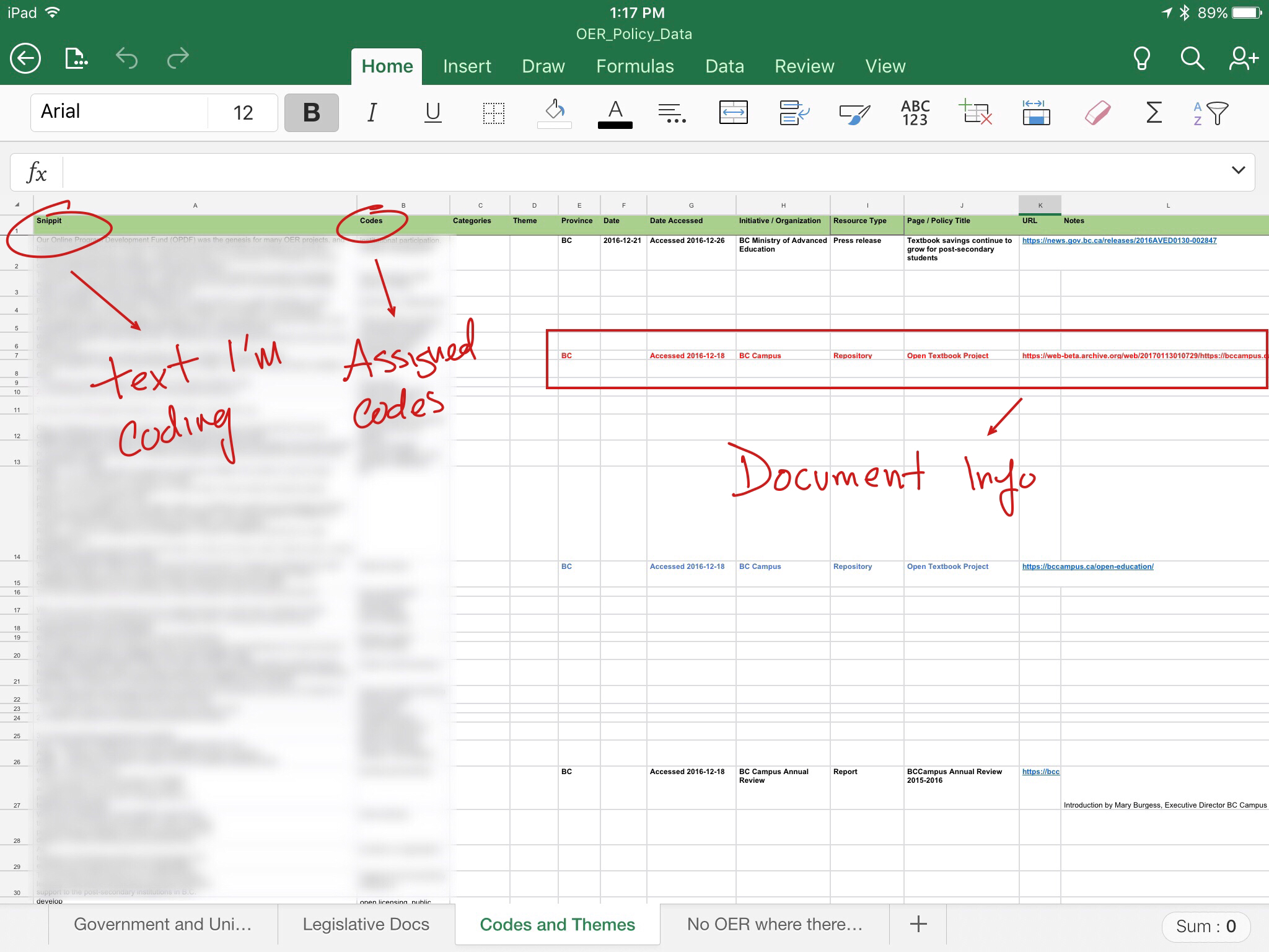 I also have the document details on the right, in the same format as the previous sheet. Some people don’t agree with this approach because you’re not separating yourself from the documents when creating themes from your codes. My work around is to cover up these details when I organize my codes into themes. Just temporarily shade cells you don’t want to see in black. Problem solved!