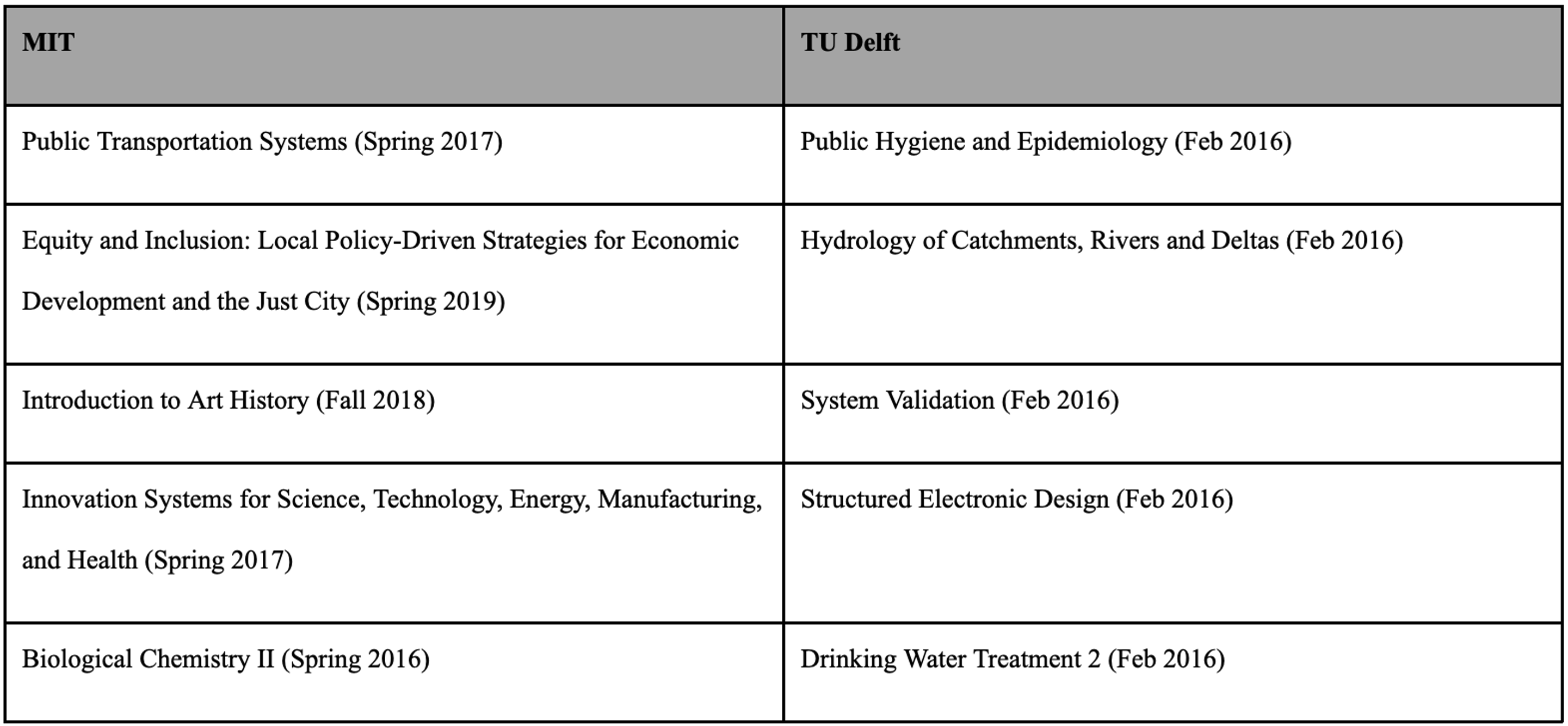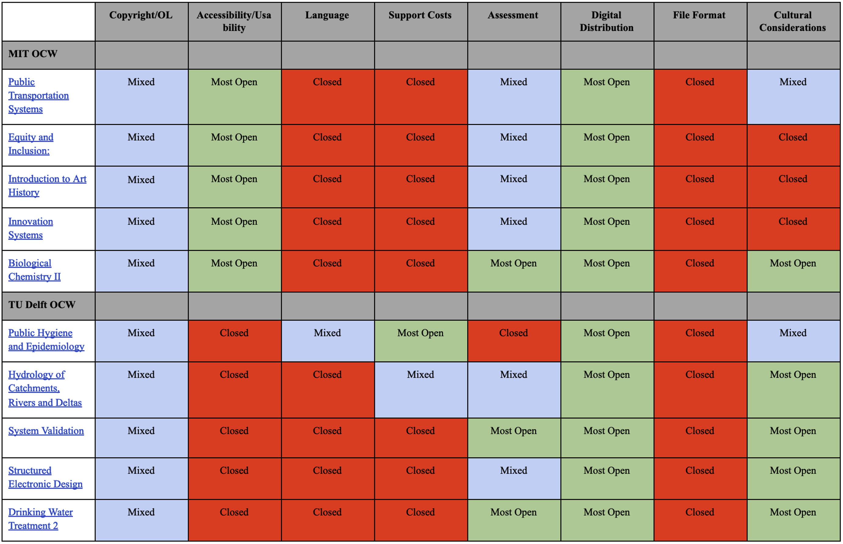 The level of openness across the sampled OCW was inconsistent. From a copyright perspective, the OCW were mixed as they employed an institutional licence across all content — a CC-NC-SA licence. In terms of adherence to accessibility standards, MIT courses were most open while TU Delft were closed. We determined accessibility openness by reviewing each OCW platform’s statement regarding which accessibility standards were observed. From a usability perspective, we concluded that TU Delft has the more modern interface, but MIT courses were more navigable. All courses (except one) were categorized as closed since the course content was offered in one language. The majority of support costs (course readings) were proprietary and many of the courses relied heavily on paid books. Two TU Delft courses were the exception to this rule; one course’s readings were completely custom (presumably written by the instructor), and another course made its proprietary ebook openly available (albeit with a closed licence). All of the sampled courses were very open in terms of digital distribution. Each course could be located using several federated OER search engines. Surprisingly, the sampled courses were categorized as closed in terms of file format, as all relied heavily on PDF content. We struggled with the cultural considerations factor, given the large volume of content and the factor’s subjective nature. Courses were split between closed and mixed/most open. Course content dictated this conclusion, as STEM courses materials were determined to be more culturally applicable, broadly speaking.