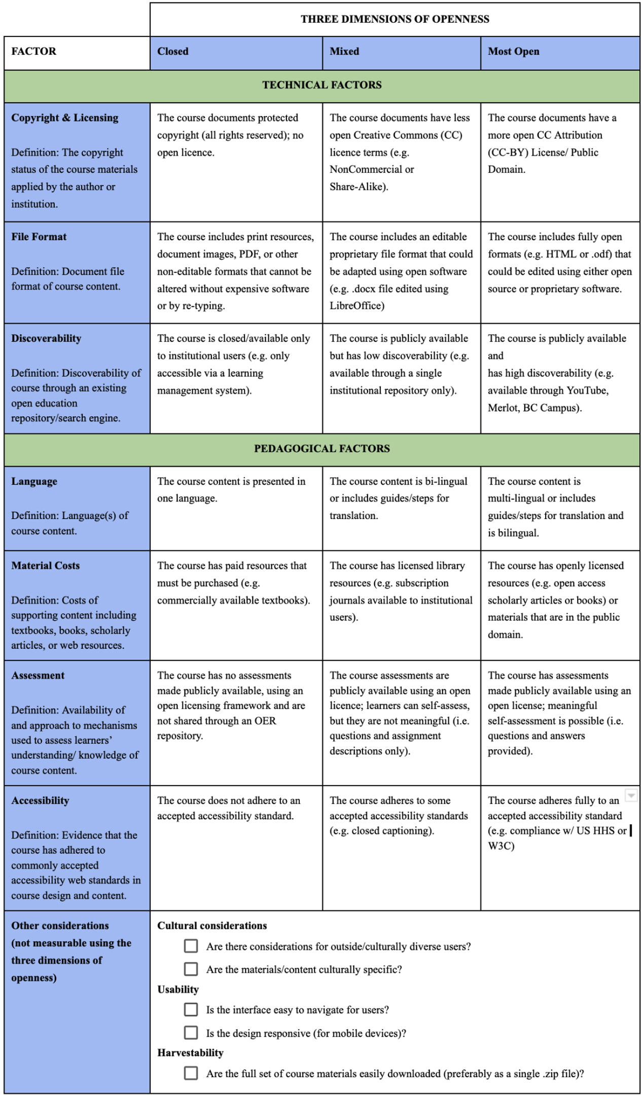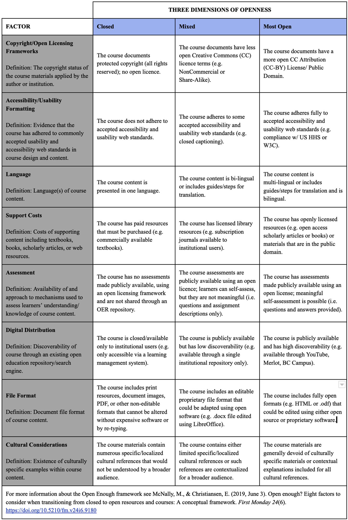 There are quite a few findings, but I’ll give a couple of highlights. First, we found the framework (called ‘Open Enough’) functioned reasonably well as a rubric for OCW evaluation, though it had some shortcomings. We proposed a revised version of the framework in the discussion. We also found that despite the name ‘open courseware’, the openness of these courses was a mixed bag, at least when evaluating them using our eight factors of analysis. Our results and discussion sections are long, but the paper includes a summary of the findings.
