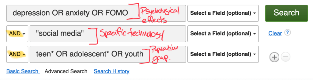 You write your topic in the middle of a page (or use an app that allows you to draw). Divide the topic or research question into themes. In the example above, one theme could be “psychological effects” since that’s not very specific. “Technology” is another theme. It might include things like social media, mobile devices, etc. The themes ultimately help you create a search with all the relevant synonyms for a database search. See the following example.