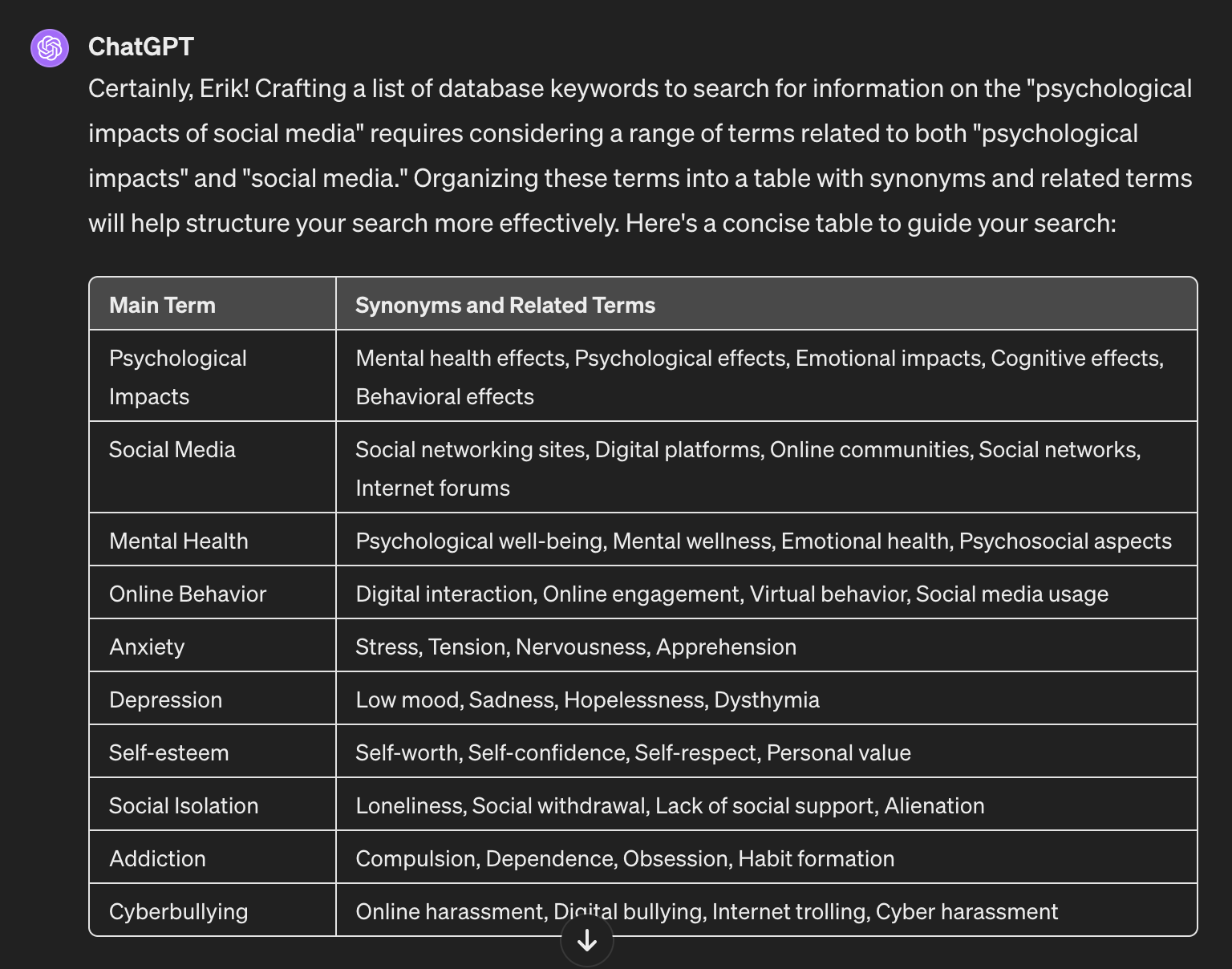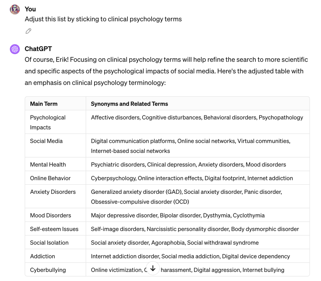 - Be specific. Be specific about the discipline you’re conducting research in. Be specific about the types of terms you want (eg. technical terms, medical terms, etc.). AI gets a bad rap for creating nonsense ideas, but this is far less likely if you provide specific instructions