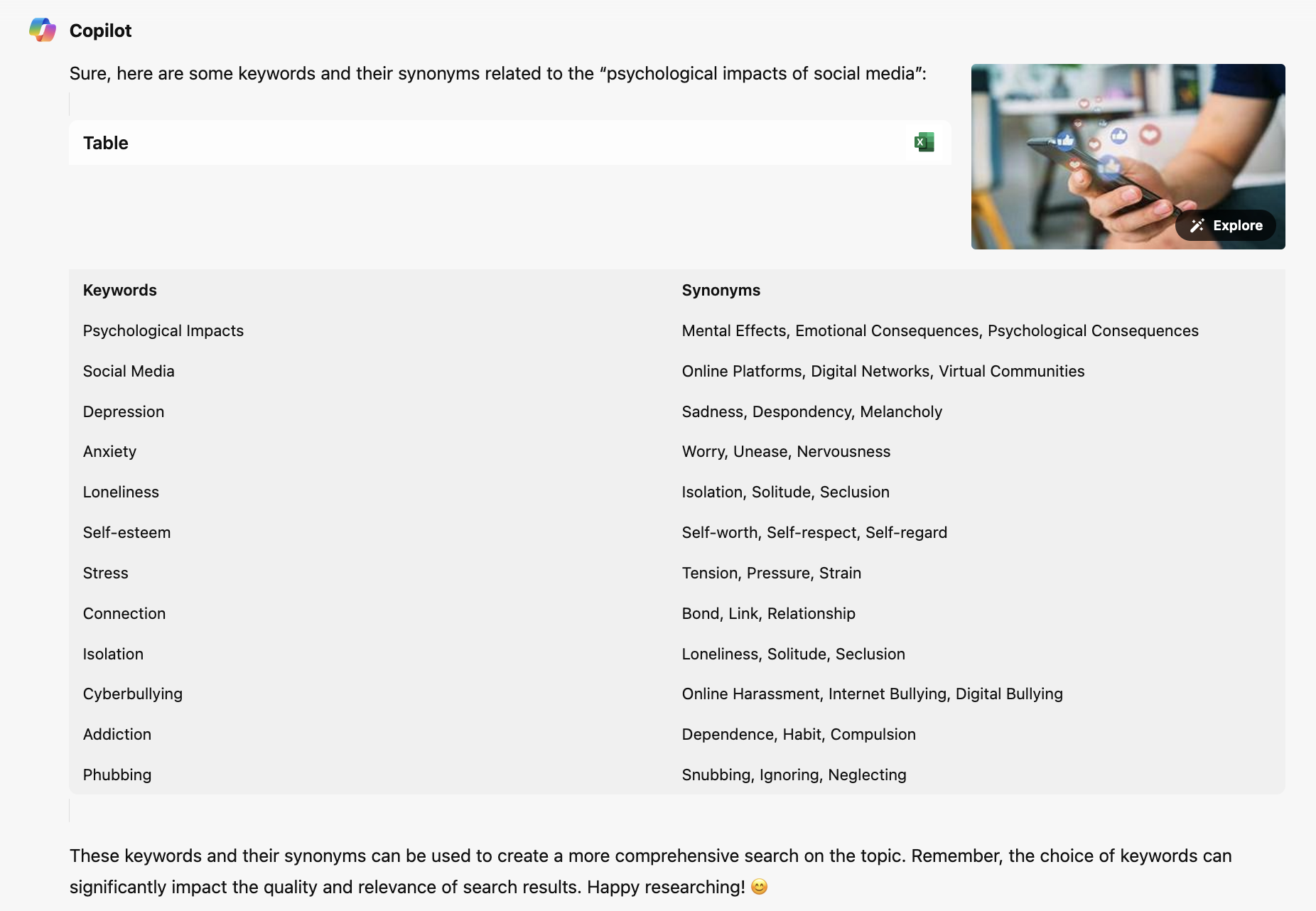 - Compare the outputs of several AI. Tools like ChatGPT and Microsoft’s Copilot are similar but produce subtle differences in tone and exhaustiveness of the answer. Similar to replicating a search strategy across different databases, try the same prompt using different tools.